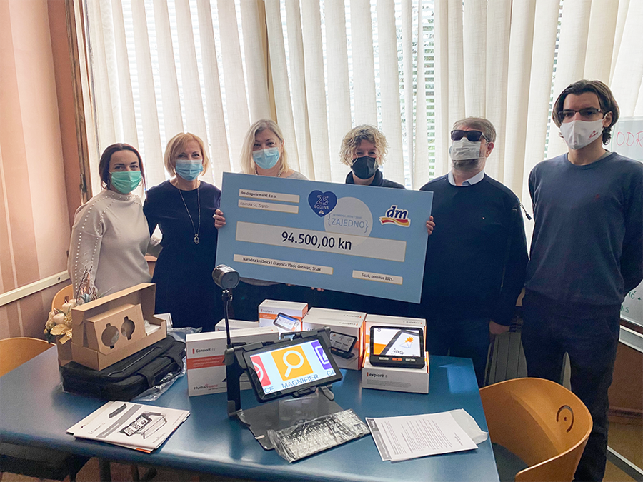 U sklopu natječaja {ZAJEDNO} za Petrinju, Glinu i Sisak, u kategoriji Kultura, znanost i sport dm je Udruženju za unapređivanje obrazovanja slijepih i slabovidinih osoba i Narodnoj knjižnici i čitaonici Vlado Gotovac u Sisku donirao pomagala za slijepe i slabovidne te osobe starije životne dobi. Donirali smo stolno povećalo Connect 12 i ručna povećala Explore 5 i Explore 8 u vrijednosti od 94.500,00 kn koja omogućuju svakoj slijepoj i slabovidnoj osobi samostalnost te olakšavaju svakodnevni život.